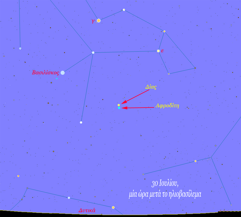 Η Αφροδίτη δίπλα στον Δία και ο Βασιλίσκος λίγο πιο πάνω αριστερά