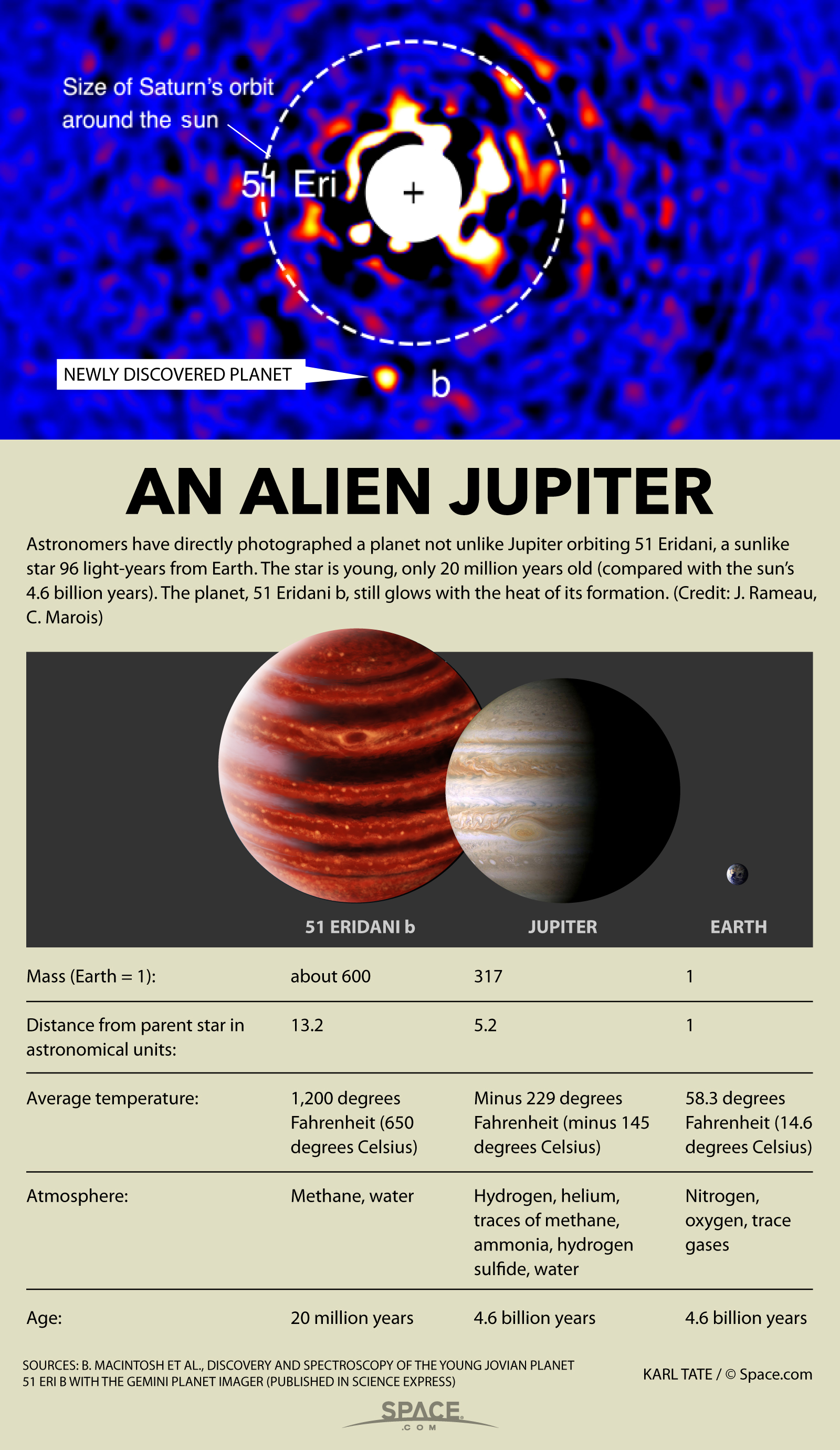 Οι αστρονόμοι ανακάλυψαν με επίγειο τηλεσκόπιο τον μικρότερο εξωπλανήτη που έχει μέχρι σήμερα άμεσα παρατηρηθεί από τη Γη. Πρόκειται για έναν πολύ νεαρό αέριο γίγαντα, σε απόσταση περίπου 96 ετών φωτός, που μοιάζει με τον Δία στα «νιάτα» του, αλλά έχει διπλάσιο μέγεθος. Περιβάλλεται από μία ατμόσφαιρα πλουσιότερη σε μεθάνιο από κάθε άλλο γνωστό εξωπλανήτη, ενώ η επιφανειακή θερμοκρασία του υπολογίζεται σε 430 βαθμούς Κελσίου.