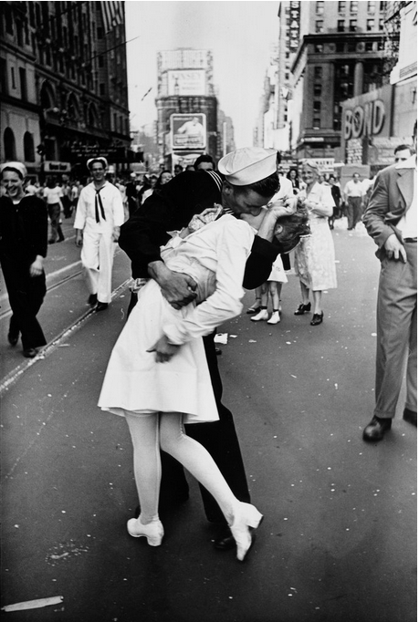 Αυτή είναι η χρονική στιγμή που ο ναύτης φιλάει στο στόμα μια γυναίκα στην Times Square της Νέας Υόρκης, πανηγυρίζοντας την λήξη του 2ου Παγκοσμίου Πολέμου, σε μια από τις πιο διάσημες φωτογραφίες του 20ου αιώνα. Το ημερολόγιο έγραφε 14 Αυγούστου 1945, και οι Ιάπωνες υπέγραφαν την παράδοσή τους, την ημέρα που αργότερα ονομάστηκε V-J Day (Victory over Japan Day).