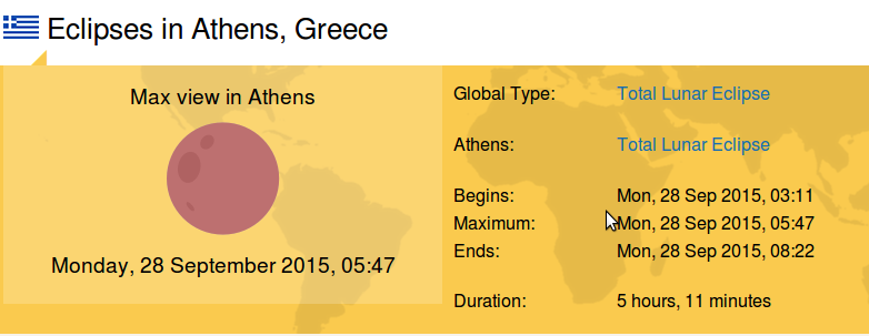 Η ολική φάση ξεκινάει στις 5.11 (Ελληνική θερινή ώρα) το πρωί της Δευτέρας 28/9, το μέγιστο είναι στις 5.47 και το τέλος της ολικής φάσης στις 6.23. Είναι «καλές» ώρες για παρατήρηση από την Ελλάδα, απλά χρειάζεται να ξυπνήσουμε λίγο νωρίς. Ο ουρανός θα είναι, στην αρχή τουλάχιστον, κατασκότεινος.