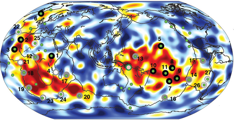 Το εντυπωσιακό είναι πως όλα τα λοφία δείχνουν να πηγάζουν από δύο θερμές περιοχές στη βάση του μανδύα, διαμέτρου 5.000 χιλιομέτρων η καθεμία, οι οποίες βρίσκονται σε αντιδιαμετρικές θέσεις κάτω από την Αφρική και τον Ειρηνικό.