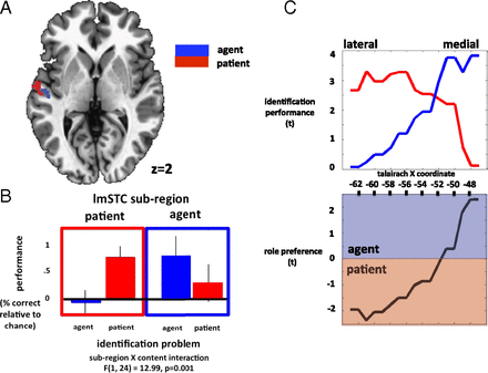 Πιο συγκεκριμένα, μέσα στην ευρύτερη περιοχή του lmSTC, οι επιστήμονες εντόπισαν μία υποπεριοχή που ασχολείται με τον θύτη, δηλαδή με το ποιος κάνει κάτι, μία υποπεριοχή που ασχολείται με το ρήμα, δηλαδή με το τι κάνει, και μία τρίτη υποπεριοχή που ασχολείται με τον παθόντα, δηλαδή σε ποιον γίνεται κάτι. «Ολες αυτές οι περιοχές φαίνεται να λειτουργούν ανεξάρτητα η μία από την άλλη», λέει ο δρ Φράνκλαντ, εξηγώντας, για παράδειγμα, ότι είτε ο άνδρας κυνήγησε τον σκύλο είτε ο άνδρας γρατσούνισε τη γάτα, η δραστηριότητα στην περιοχή του θύτη είναι όμοια.