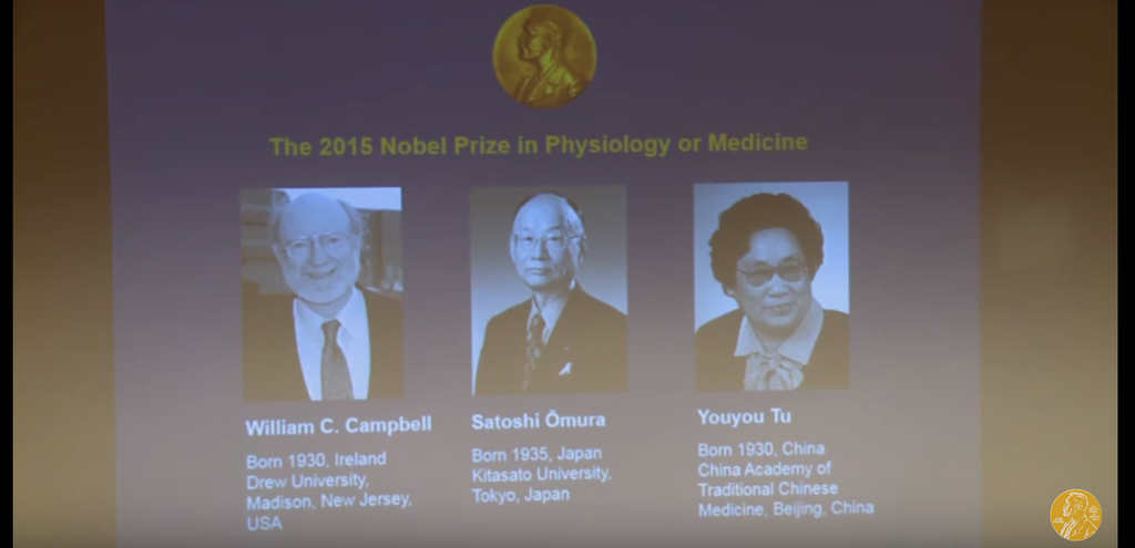 Οι βραβευθέντες με το Νόμπελ Ιατρικής-Φυσιολογίας 2015: William C. Campbell (1/4), Satoshi Ōmura (1/4) και Youyou Tu (1/2)