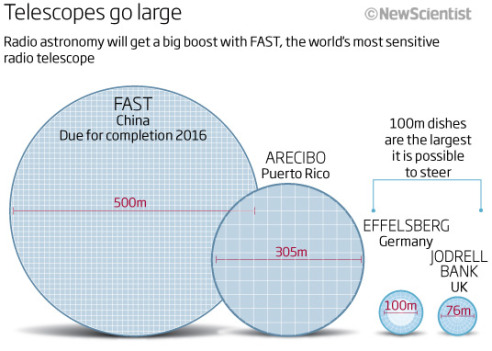 Για να καταλάβουμε το μέγεθος του τηλεσκοπίου, το F.A.S.T. θα είναι πέντε φορές μεγαλύτερο από το μεγαλύτερο ραδιοτηλεσκόπιο στη Δυτική Ευρώπη, στο Έφελσμπεργκ της Γερμανίας, που ήταν και το μεγαλύτερο πλήρως στρεφόμενο ραδιοτηλεσκόπιο σε όλο τον κόσμο επί 30 χρόνια, μέχρι τη λειτουργία του τηλεσκοπίου του Γκριν Μπανκ των ΗΠΑ το 2000.
