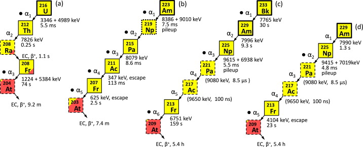 Τα νέα ισότοπα 216U, 219Np, 233Bk, 223Am και 229Am δημιουργήθηκαν ως τελικά προϊόντα τέτοιων συγκρούσεων. Πρόκειται για ασταθείς πυρήνες που διασπώνται επίσης μετά από λίγα χιλιοστά του δευτερολέπτου ή δευτερόλεπτα, ανάλογα με το ισότοπο. Όλα τα προϊόντα διάσπασης διαχωρίζονται και αναλύονται χρησιμοποιώντας ειδικά φίλτρα από ηλεκτρικά και μαγνητικά πεδία. Οι ερευνητές χρησιμοποιώντας τις πληροφορίες από τα προϊόντα διάσπασης που ανιχνεύονται, ταυτοποιούν τα νέα ισότοπα που δημιουργούνται.