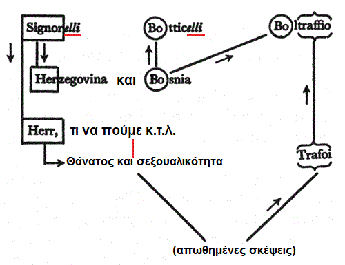Το όνομα Signorelli διασπάστηκε στην κατάληξη «-elli» (που αυτούσια πέρασε στο υποκατάστατο Botticelli) και τις συλλαβές «Signor», που μεταφρασμένες σε Herr, συνάπτουν ποικίλες και πολυάριθμες σχέσεις με τις λέξεις του απωθημένου θέματος, και γι αυτό χάνονται στην προσπάθεια αναπαραγωγής του ονόματος Signorelli. Τα υποκατάστατα παρήχθησαν σα να συντελέστηκε μια μετάθεση κατά μήκος της συνειρμικής σειράς «Ερζεγοβίνη και Βοσνία», ανεξάρτητα απ’ την έννοια (το σημαινόμενο) και τον ακουστικό περιορισμό των συλλαβών, παρόμοια με την κατασκευή ενός κρυπτογραφικού μηνύματος.