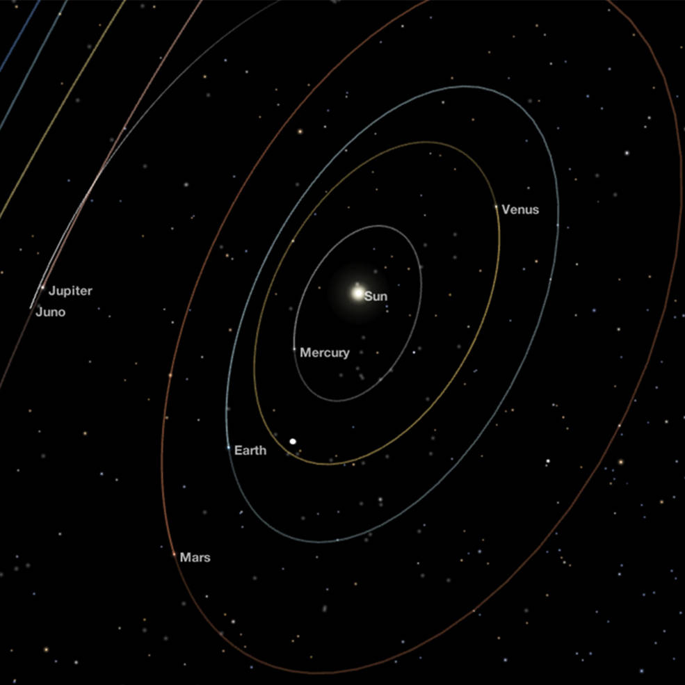 juno_nasa_image_may_6_Το διαστημικό σκάφος Juno βρίσκεται σε απόσταση 724 εκατομμύρια χιλιόμετρα από τη Γη. Ένα ραδιοσήμα του Juno χρειάζεται περίπου 40 λεπτά για να φτάσει στη Γη. Το Juno κινείται ως προς τη Γη με ταχύτητα 26.8 km/s χιλιόμετρα ανά δευτερόλεπτο, ως προς τον Ήλιο με ταχύτητα 6,7 km/s και με ταχύτητα 6 km/s.