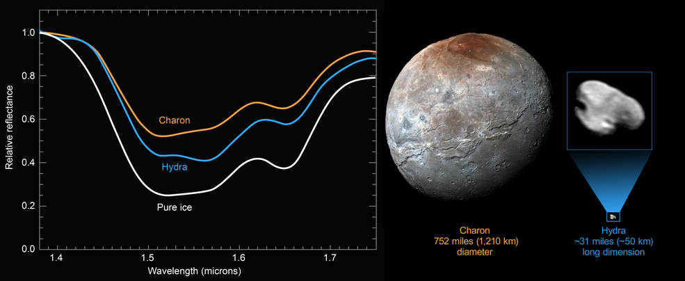 Τα νέα δεδομένα από το διαστημικό σκάφος New Horizons της NASA αποδεικνύουν την ύπαρξη καθαρού πάγου στην επιφάνεια της Ύδρας, του δορυφόρου του Πλούτωνα. Η διάμετρος της Ύδρας είναι μόλις 50 χιλιόμετρα, ενώ η διάμετρος του Χάροντα, του μεγαλύτερου δορυφόρου του Πλούτωνα, είναι 1210 χιλιόμετρα