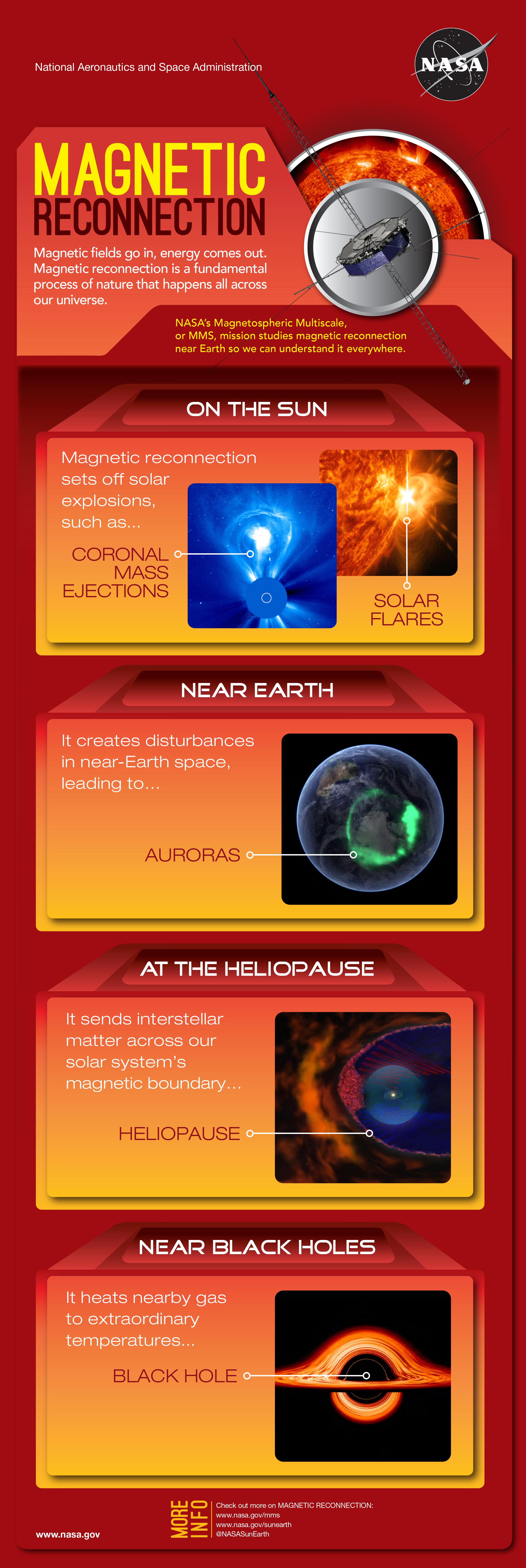Οι τέσσερις πανομοιότυποι δορυφόροι της αποστολής Magnetospheric Multiscale Mission (MMS) της NASA, οι οποίοι εκτοξεύθηκαν τον Μάρτιο του 2015, για πρώτη φορά ταξίδεψαν κατ’ ευθείαν στο επίκεντρο της μαγνητικής επανασύνδεσης και την κατέγραψαν με τα όργανά τους. Οι επιστήμονες από διάφορες χώρες, με επικεφαλής τον Τζέιμς Μπερτς του Νοτιοδυτικού Ινστιτούτου Ερευνών στο Τέξας, έκαναν τη σχετική δημοσίευση στην επιθεώρηση «Science».
