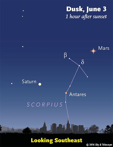 Αριστερά από τον Αντάρη διακρίνεται ένας ακόμα πλανήτης, ο κάτασπρος Κρόνος. Είναι σχετικά εύκολο να ξεχωρίσετε τους πλανήτες επειδή δεν τρεμοπαίζουν τόσο όσο τα άστρα, τα οποία εμφανίζονται ως σημειακές πηγές φωτός.