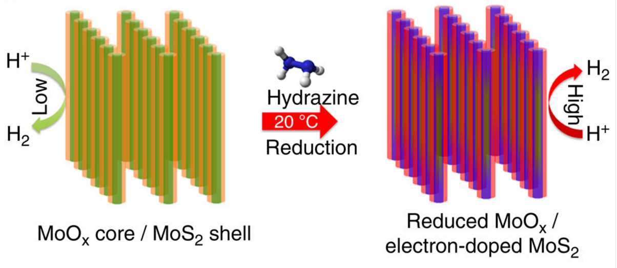 Στην εργασία των Cummins et al [2] μελετάται το υλικό ΜoS2 ή ο συνδυασμός MoOx /ΜoS2 ως προς την ηλεκτροκατάλυση της αντίδρασης παραγωγής υδρογόνου. Η προσθήκη διαλύματος υδραζίνης στο υλικό ΜoS2 αυξάνει σημαντικά την ηλεκτροκαταλυτική απόδοση. Επιπλέον φαίνεται πως το ΜoS2 αλλάζει την ημιαγώγιμη συμπεριφορά του προς περισσότερο μεταλλική (αγώγιμη) μετά την έκθεσή του στην υδραζίνη.