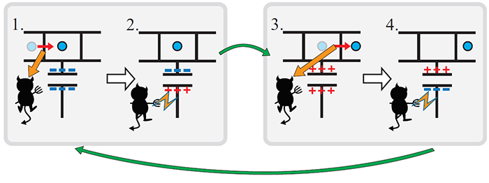 Αυτό ακριβώς παρουσιάστηκε πέρυσι στη Φινλανδία. Ο Γιούκα Πέκολα και η ομάδα του στο Πανεπιστήμιο του Aalto στο Espoo δημιούργησαν έναν μικροσκοπικό δαίμονα με παγερή και ισχυρή απλότητα [On-chip Maxwell’s demon as an information-powered refrigerator]. Η διάταξή τους, την οποία είχαν προτείνει αρχικά ο Μασιμιλιάνο Εσπόζιτο από το Πανεπιστήμιο του Λουξεμβούργου και οι συνεργάτες του, βασίζεται σε δυο κβαντικές κουκκίδες, συσκευές οι οποίες μπορούν για σύντομο διάστημα να παγιδεύουν απλά ηλεκτρόνια. Η μία είναι γνωστή ως «σύστημα», η άλλη είναι ο «δαίμονας». Ο δαίμονας παγιδεύει κάθε τόσο ένα ηλεκτρόνιο, χαλαρά. Οταν ένα ηλεκτρόνιο φθάνει στο σύστημα, απωθεί και διώχνει ηλεκτροστατικά το ηλεκτρόνιο του δαίμονα. Η διαδικασία αυτή αφαιρεί από το ηλεκτρόνιο του συστήματος ένα μέρος της δυναμικής ενέργειάς του, κάτι το οποίο σημαίνει ότι για να φύγει το ηλεκτρόνιο αυτό από το σύστημα θα πρέπει να χρησιμοποιήσει ένα μέρος της θερμικής ενέργειάς του. Ως αποτέλεσμα φθάνει στα καλώδια ψυχρότερο από ό,τι ήταν τη στιγμή που έφυγε.