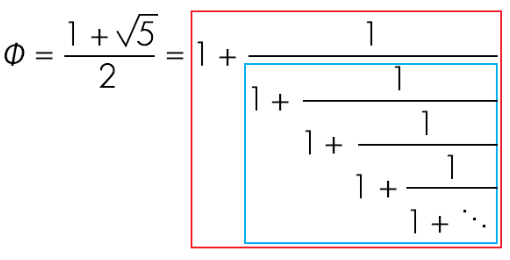 Ο Ραμανουτζάν είχε εντυπωσιάσει τον καθηγητή του Κέμπριτζ, Χάρντι με τους εκπληκτικούς τύπους των συνεχών κλασμάτων που ανακάλυπτε. Σε ένα συνεχές κλάσμα ο παρονομαστής του αποτελείται από έναν αριθμό συν ένα κλάσμα, του οποίου ο παρονομαστής αποτελείται από έναν αριθμό συν ένα κλάσμα κ.ο.κ. Η σχέση που ακολουθεί συσχετίζει ένα συνεχές κλάσμα με την χρυσή αναλογία: