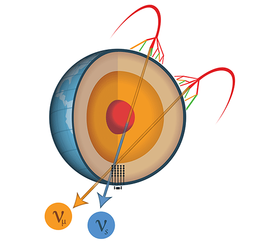 Για την αναζήτηση των στείρων νετρίνων το πείραμα IceCube (οι μαύρες τελείες στο παραπάνω σχήμα) ψάχνει την πιθανή εξαφάνιση των νετρίνων του μιονίου (νμ) – σχηματίζονται στην ατμόσφαιρα της Γης από την κοσμική ακτινοβολία – και φτάνουν στον ανιχνευτή αφού έχουν διασχίσει τη Γη. Αν τα στείρα νετρίνα υπάρχουν τότε η ύλη του πυρήνα της Γης θα ενίσχυε την ταλάντωση των νετρίνων του μιονίου προς στείρα νετρίνα (νs), δημιουργώντας ένα εμφανές έλλειμμα μόνο στην μια από τις τρεις γεύσεις των νετρίνων που προβλέπει το Καθιερωμένο Πρότυπο των στοιχειωδών σωματιδίων