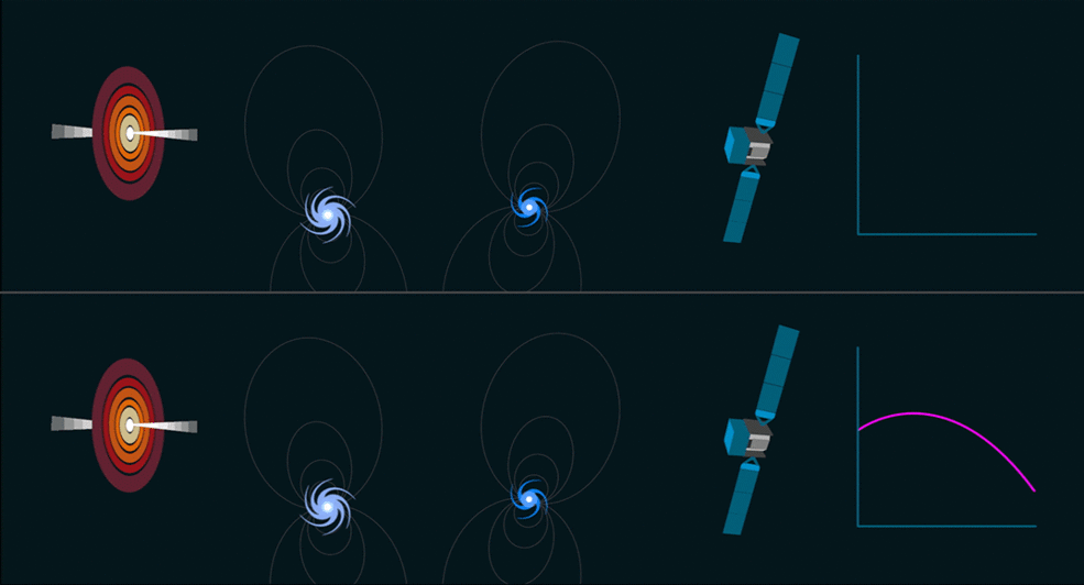 Πάνω: Οι ακτίνες γάμμα που έρχονται από τον γαλαξία NGC 1275 – βρίσκεται στο σμήνος των γαλαξιών του Περσέα – δημιουργούν ένα συγκεκριμένο φάσμα (πάνω δεξιά). Οι εκπομπή των ακτίνων από τον NGC 1275 οφείλεται στην υπερμεγέθη μαύρη τρύπα που υπάρχει στο κέντρο του. Κάτω: Οι ακτίνες γάμμα μετατρέπονται σε σωματίδια τύπου αξιονίων (πράσινο διακεκομμένο) και γίνονται πάλι φωτόνια όταν συναντούν μαγνητικά πεδία (γκρι γραμμές). Το φάσμα των ακτίνων γ που θα προκύψει στην περίπτωση αυτή (η καμπύλη κάτω δεξιά) θα είναι είναι παραμορφωμένο