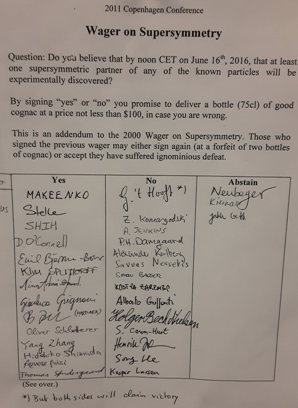 Οι φυσικοί που συναντήθηκαν σήμερα στην Κοπεγχάγη διευθέτησαν ένα στοίχημα που είχε τεθεί πριν από 16 χρόνια. Το 2000, όταν άρχισε η κατασκευή του Μεγάλου Επιταχυντή Αδρονίων (LHC) στο CERN – ο μεγαλύτερος μεγαλύτερος επιταχυντής σωματιδίων στον κόσμο – κάποιοι φυσικοί στοιχημάτισαν ότι σε 10 χρόνια θα ανίχνευε τουλάχιστον ένα υπερσυμμετρικό σωματίδιο. Παίρνοντας υπόψη τους το πισωγύρισμα εξαιτίας αναπάντεχων βλαβών, τον Ιούνιο του 2011, υπογράφηκε παράταση πέντε ετών, μέχρι την 16η Ιουλίου του 2016.
