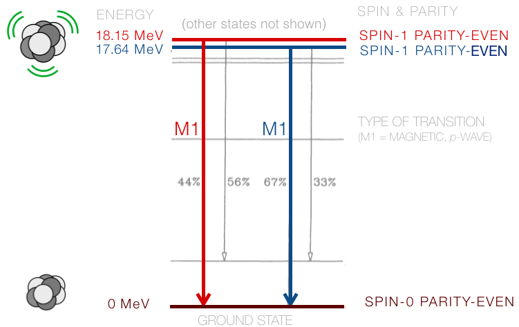 Διεγερμένες καταστάσεις του βηρυλλίου-8. Η κατάσταση των 18.15 MeV (κόκκινο) εμφανίζει μια ανωμαλία.
