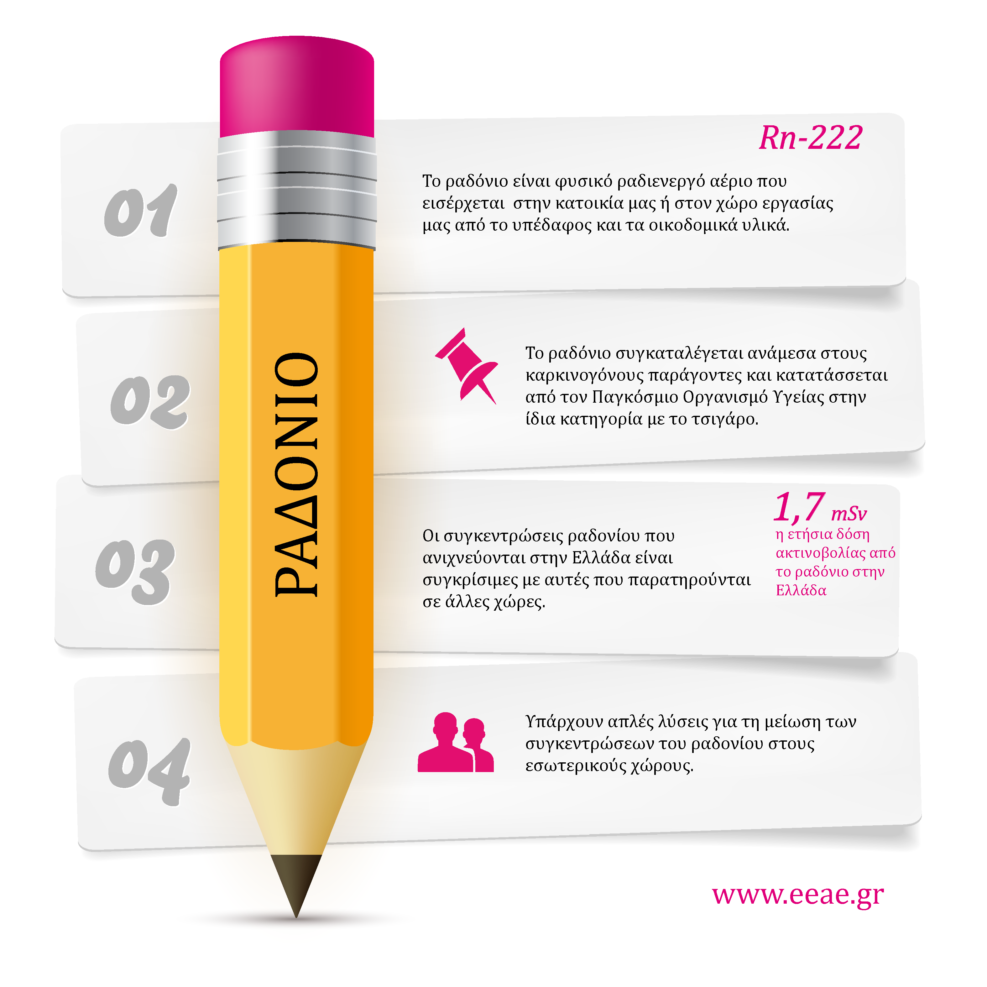 Με τη συνεργασία των αρχών τοπικής αυτοδιοίκησης σε όλη τη χώρα η ΕΕΑΕ υλοποιεί ένα μακροπρόθεσμο σχέδιο χαρτογράφησης των συγκεντρώσεων ραδονίου σε κατοικίες σε όλη την Ελλάδα. Η συντονισμένη προσπάθεια καταγραφής των συγκεντρώσεων ραδονίου στον εσωτερικό αέρα κατοικιών σε όλη τη χώρα (εθνική επισκόπηση ραδονίου) ξεκίνησε το 2010 και συνεχίζεται εντατικά. Μετρώνται οι συγκεντρώσεις ραδονίου σε κατοικίες, δειγματοληπτικά, σε όλη την Ελλάδα και καταχωρούνται στην εθνική βάση ραδονίου που έχει δημιουργήσει η ΕΕΑΕ, προκειμένου να εκτιμηθεί η μέση ετήσια δόση που λαμβάνει ο πληθυσμός και να εντοπιστούν οι περιοχές με αυξημένες συγκεντρώσεις ραδονίου στο εσωτερικό των κατοικιών. Η συμμετοχή στο πρόγραμμα είναι εθελοντική και πραγματοποιείται με τη συμβολή των δήμων, οι οποίοι αναλαμβάνουν τη διανομή και συλλογή των ανιχνευτών κατόπιν οδηγιών της ΕΕΑΕ.