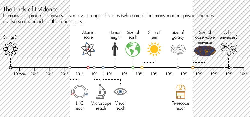 Οι άνθρωποι μπορούν να εξερευνήσουν το σύμπαν σε μια μεγάλη περιοχή της παρακάτω κλίμακας (λευκή περιοχή). Δυστυχώς όμως, μερικές από τις σύγχρονες θεωρίες της φυσικής διαδραματίζονται αρκετά έξω από αυτή την περιοχή (γκρι):