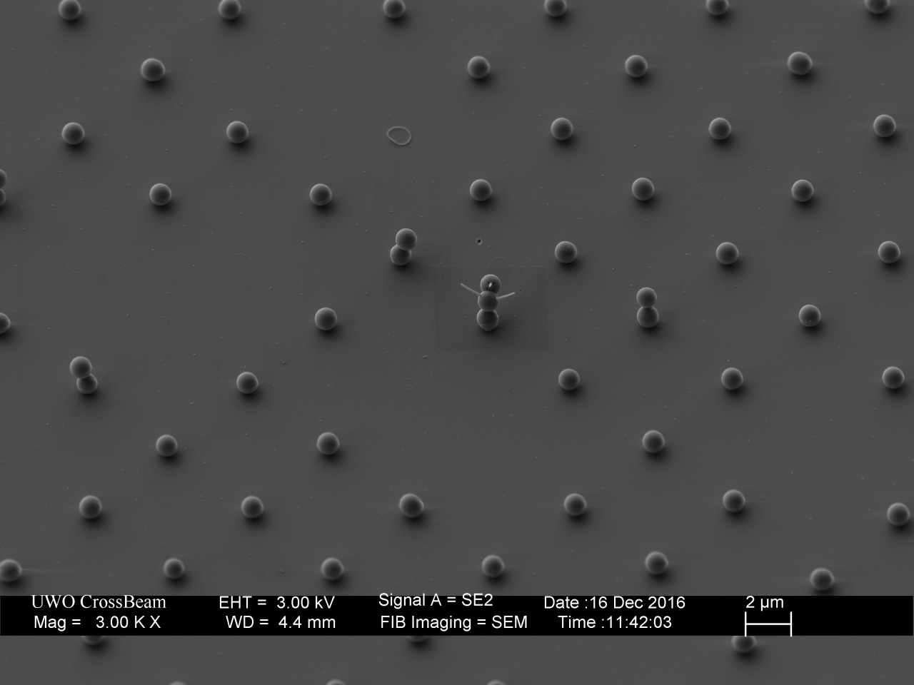 Δεν είναι φτιαγμένος από χιόνι, αλλά από τρία σφαιρίδια πυριτίου διαμέτρου 0,9 μm το καθένα. Εστιάζοντας δέσμη ιόντων οι επιστήμονες από το πανεπιστήμιο του Δυτικού Οντάριο, στον Καναδά, χάραξαν τα μάτια και το στόμα, και τοποθέτησαν χέρια και μύτη από πλατίνα. Ο πρώτος νανο-χιονάνθρωπος δημιουργήθηκε κατά λάθος τo 2005 από τον Todd Simpson, ενώ προσπαθούσε να απομονώσει σφαίρες πυριτίου.