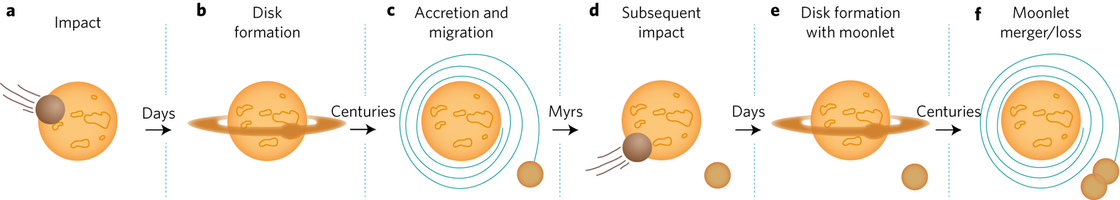 Το νέο μοντέλο υποθέτει ότι, σε διάστημα 100 εκατομμυρίων ετών, υπήρξαν περίπου 20 προσκρούσεις στη Γη σωμάτων διαφόρων μεγεθών. Από τις διαδοχικές προσκρούσεις, γύρω από τον πλανήτη μας σχηματίσθηκαν δακτύλιοι υλικών παρόμοιοι με του Κρόνου. Με το πέρασμα του χρόνου, αυτά τα υλικά σχημάτισαν μικρά φεγγάρια, ώπου τελικά με τη σειρά τους δημιούργησαν τη Σελήνη.