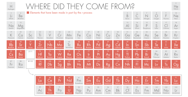 Με κόκκινο τα στοιχεία που δημιουργούνται διαμέσου της διαδικασίας r (Lucy Reading-Ikkanda/Quanta Magazine)