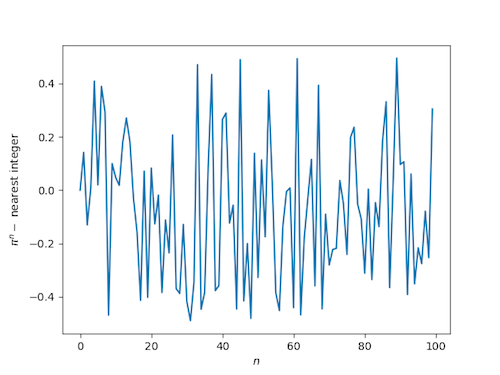 Η διαφορά μεταξύ πn και του πλησιέστερου ακεραίου αριθμού. Σε αντίθεση με το αντίστοιχο διάγραμμα του αριθμού φ δείχνει να μεταβάλλεται τυχαία με ομοιόμορφο τρόπο.