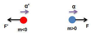 Για παράδειγμα οι δυο ετερόσημες μάζες του σχήματος, οι οποίες αρχικά ήταν ακίνητες, ασκούν η μία στην άλλη απωστικές δυνάμεις. Έτσι, η θετική μάζα επιταχύνεται προς την κατεύθυνση της δύναμης F, ενώ η αρνητική μάζα επιταχύνεται αντίθετα προς την κατεύθυνση της δύναμης F’:
