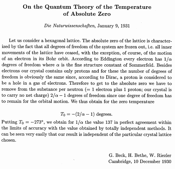 Ας θεωρήσουμε ένα εξαγωνικό κρυσταλλικό πλέγμα. Το απόλυτο μηδέν του πλέγματος χαρακτηρίζεται από το γεγονός ότι όλοι οι βαθμοί ελευθερίας του συστήματος έχουν παγώσει, δηλαδή όλες οι εσωτερικές κινήσεις του πλέγματος έχουν σταματήσει, με εξαίρεση, ασφαλώς, της κίνησης ενός ηλεκτρονίου στην τροχιά του Bohr. Σύμφωνα με τον Eddington, κάθε ηλεκτρόνιο έχει 1/α βαθμούς ελευθερίας, όπου α είναι η σταθερά λεπτής υφής του Sommerfeld. Πέραν των ηλεκτρονίων ο κρύσταλλός μας περιέχει μόνο πρωτόνια και γι αυτά ο αριθμός των βαθμών ελευθερίας είναι προφανώς ο ίδιος, διότι σύμφωνα με τον Dirac, ένα πρωτόνιο θεωρείται ως μια οπή σε ένα νέφος ηλεκτρονίων. Συνεπώς για να φτάσουμε στο απόλυτο μηδέν πρέπει να αφαιρέσουμε από το υλικό ανά νετρόνιο (=1 ηλεκτρόνιο συν 1 πρωτόνιο· ο κρύσταλλός μας είναι ηλεκτρικά ουδέτερος) 2/α − 1 βαθμούς ελευθερίας, επειδή ένας βαθμός ελευθερίας πρέπει να παραμείνει για την τροχιακή κίνηση. Έτσι παίρνουμε για την θερμοκρασία του απολύτου μηδενός: Τ0 = −(2/α – 1) βαθμούς. Θέτοντας όπου Τ0 = −273ο, παίρνουμε για τον όρο 1/α την τιμή 137, η οποία βρίσκεται σε εξαιρετική συμφωνία με την τιμή που προκύπτει από εντελώς ανεξάρτητες μεθόδους. Μπορεί να διαπιστωθεί πολύ εύκολα ότι το αποτέλεσμά μας είναι ανεξάρτητο από το συγκεκριμένο κρυσταλλικό πλέγμα που επιλέχθηκε.