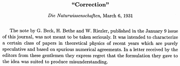 Το 1931 δημοσιεύθηκε στο επιστημονικό περιοδικό Die Naturwissenschaften, ένα πολύ σύντομο άρθρο των G. Beck, H. Bethe (βραβείο Νόμπελ Φυσικής 1956), και W. Riezler: