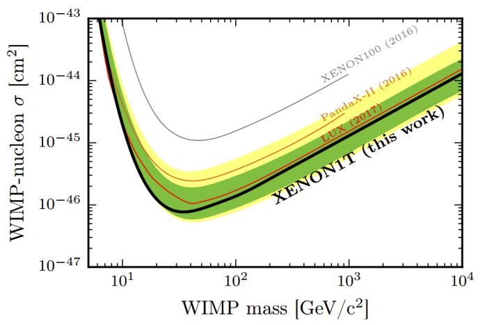 Στο διάγραμμα που ακολουθεί βλέπουμε το όριο στην πιθανότητα αλληλεπίδρασης των σωματιδίων σκοτεινής ύλης με τα νουκλεόνια της κανονικής ύλης, συναρτήσει της μάζας των WIMPs, όπως καθορίζεται από τις πρώτες μετρήσεις του φιλόδοξου πειράματος XENON1T.