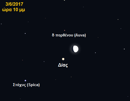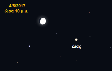 Απόψε το βράδυ είναι πολύ εύκολο να εντοπίσoυμε στον ουρανό τον πλανήτη Δία. Όπου κι αν βρίσκεστε, σηκώστε το βλέμμα σας στον νυχτερινό ουρανό και βρείτε τη Σελήνη – το πιο λαμπερό αστέρι πολύ κοντά στην Σελήνη θα είναι ο Δίας. Για παράδειγμα, στις 10 μ.μ. θα βρίσκεται περίπου στην θέση που βλέπουμε παρακάτω: