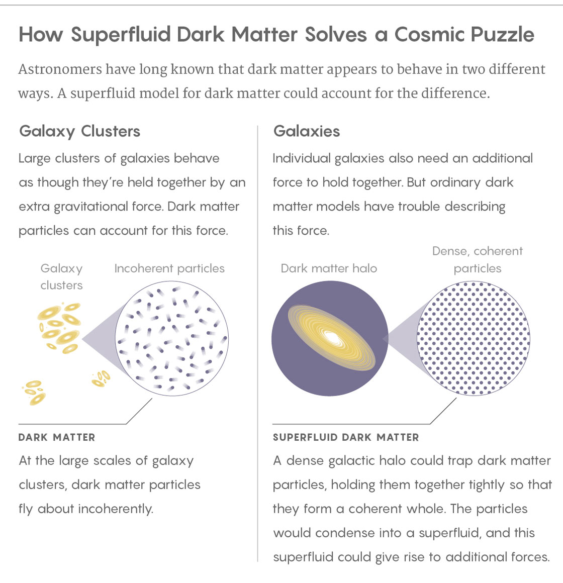 Σε μια πρόσφατη προσπάθεια επίλυσης αυτού του αινίγματος, δυο φυσικοί υποστηρίζουν πως η σκοτεινή ύλη έχει την δυνατότητα μετατροπών φάσης σε διαφορετικές κλίμακες. Οι φυσικοί Justin Khoury, στο πανεπιστήμιο της Πενσυλβάνιας και ο Lasha Berezhiani, στο πανεπιστήμιο του Πρίνστον ισχυρίζονται ότι στο ψυχρό και πυκνό περιβάλλον της γαλαξιακής άλω η σκοτεινή ύλη συμπυκνώνεται σε ένα υπερρευστό – μια εξωτική κβαντική κατάσταση της ύλης με μηδενικό ιξώδες. Αν η σκοτεινή ύλη μετασχηματίζεται σε υπερρευστό στην γαλαξιακή κλίμακα, τότε υπεισέρχεται μια νέα δυναμική που θα ερμήνευε τις παρατηρήσεις που αδυνατεί να εξηγήσει το μοντέλο της ψυχρής σκοτεινής ύλης. Στην τεράστια κλίμακα των σμηνών γαλαξιών απουσιάζουν οι ειδικές συνθήκες που απαιτούνται για την δημιουργία μιας υπέρρευστης κατάστασης και η σκοτεινή ύλη συμπεριφέρεται όπως η συμβατική ψυχρή σκοτεινή ύλη.