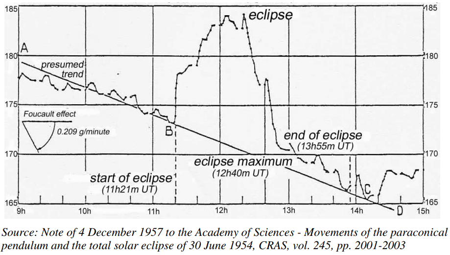 Το δεύτερο πιο διάσημο πείραμα κατά την διάρκεια έκλειψης ηλίου είναι μάλλον αυτό που έγινε το 1954 από τον Maurice Allais. Ο Allais δεν ήταν φυσικός, αλλά οικονομολόγος, που βραβεύθηκε μάλιστα με το βραβείο Νόμπελ Οικονομικών το 1988. Αλλά ενδιαφερόταν επίσης μεταξύ άλλων και για τις εναλλακτικές θεωρίες βαρύτητας και ηλεκτρομαγνητισμού. Εξέταζε την περίπτωση η βαρύτητα να επηρεάζεται από έναν κοσμικό αιθέρα, και ότι οι επιδράσεις αυτού του αιθέρα θα μπορούσαν να παρατηρηθούν κατά την διάρκεια της ηλιακής έκλειψης. Έτσι, το 1954 ο Allais υλοποίησε ένα απλό πείραμα με ένα εκκρεμές Foucault κατά την διάρκεια μιας ηλιακής έκλειψης.