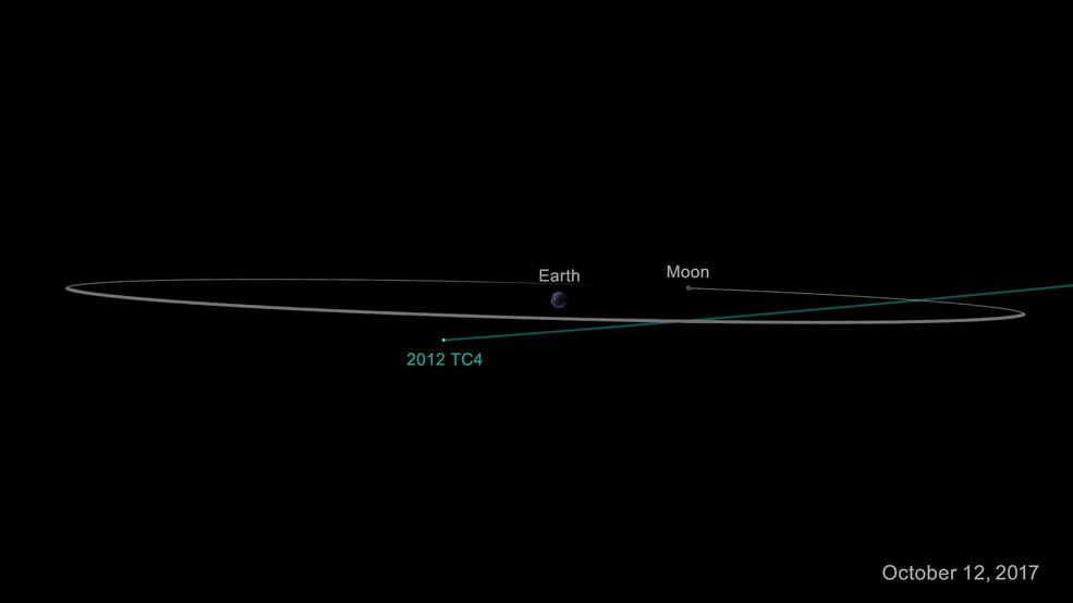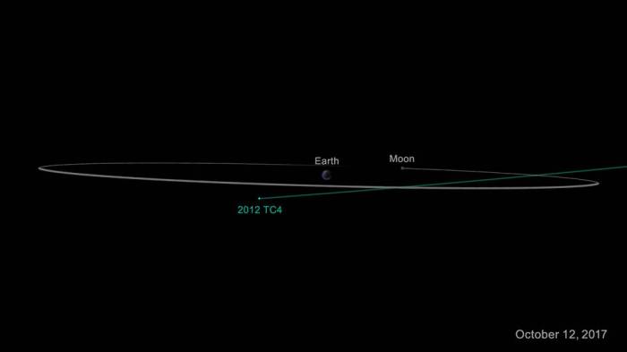 Η απεικόνιση της διέλευσης του αστεροειδούς 2012 TC4 στις 12 Οκτωβρίου 2017. Η πλησιέστερη απόσταση του αστεροειδούς από την επιφάνεια της Γης θα είναι 6800 χιλιόμετρα.