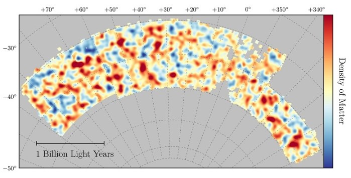 Χάρτης της σκοτεινής ύλης έτσι όπως προέκυψε από τις μετρήσεις βαρυτικής εστίασης 26 εκατομμυρίων γαλαξιών του DES. Οι κόκκινες περιοχές έχουν περισσότερη σκοτεινή ύλη από τον μέσο όρο, και οι μπλε περιοχές λιγότερη σκοτεινή ύλη.