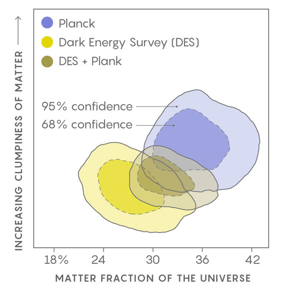 Στατιστικά υπάρχει μια διαφορά μεταξύ DES και Planck. Σύμφωνα με το Planck το 67% του σύμπαντος είναι σκοτεινή ενέργεια, ενώ σύμφωνα με το DES το 74%. Ή να το πούμε διαφορετικά, σύμφωνα με το Planck η ύλη (σκοτεινή και κανονική) αποτελούν το 33% του σύμπαντος, ενώ σύμφωνα με το DES μόνο το 26%.