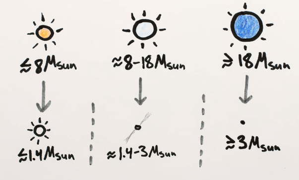 Αν το άστρο είναι μικρό, με μάζα ≤8 ηλιακές μάζες, τότε μεταπίπτει σε λευκό νάνο. Αν η μάζα του άστρου είναι από 8 έως 18 ηλιακές μάζες τότε καταλήγει σε άστρο νετρονίων, ενώ όταν η μάζα του άστρου είναι μεγαλύτερη τότε η βαρυτική κατάρρευση του άστρου θα δημιουργήσει μια μαύρη τρύπα.