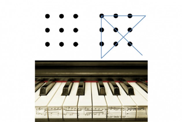 Για παράδειγμα όταν έθεταν στους εθελοντές «το πρόβλημα των εννέα σημείων», να συνδέσουν δηλαδή με τέσσερις μόνο διαδοχικές ευθείες γραμμές τα εννέα σημεία που βρίσκονται στο ίδιο επίπεδο (βλ. σχετική εικόνα), διαπίστωσαν ότι οι εθελοντές που άκουγαν ευχάριστες αρμονικές συνθέσεις (π.χ. την «Άνοιξη» από τις «Τέσσερις εποχές» του Βιβάλντι) επιδείκνυαν μεγαλύτερη αποκλίνουσα δημιουργικότητα και οδηγούνται ευκολότερα στη λύση του προβλήματος.