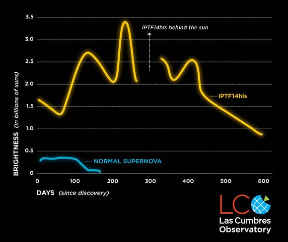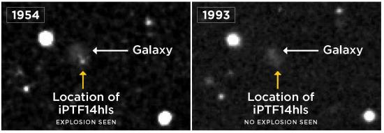 Τον Σεπτέμβριο του 2014 οι αστρονόμοι παρατήρησαν μια νέα έκρηξη στον ουρανό, ένα συμβάν που ονόμασαν iPTF14hls, και ανέλυσαν το φως που εκπέμφθηκε προκειμένου να υπολογιστεί η χημική σύνθεση και η ταχύτητα των υλικών που εκτινάχθηκαν κατά την έκρηξη. Η ανάλυση έδειξε ότι το παρατηρούμενο γεγονός αντιστοιχούσε σε μια έκρηξη σουπερνόβα τύπου ΙΙ-Ρ και όλα τα σχετικά με την ανακάλυψη φαίνονταν κανονικά. Μέχρι μερικούς μήνες μετά, όταν το σουπερνόβα άρχισε να γίνεται πάλι λαμπρότερο! Τα σουπερνόβα τύπου ΙΙ-Ρ συνήθως διατηρούν την λαμπρότητά τους για περίπου 100 ημέρες. Αλλά το iPTF14hls παρέτεινε την λαμπρότητά του για περισσότερες από 600 ημέρες! Επιπλέον, παλαιότερα δεδομένα αποκάλυψαν ότι το 1954 συνέβη έκρηξη σουπερνόβα στο ίδιο σημείο. Με λίγα λόγια, παρότι το άστρο αυτό εξερράγη μια φορά, επέζησε για να εκραγεί πάλι το 2014, μετά από μισό αιώνα και πλέον.