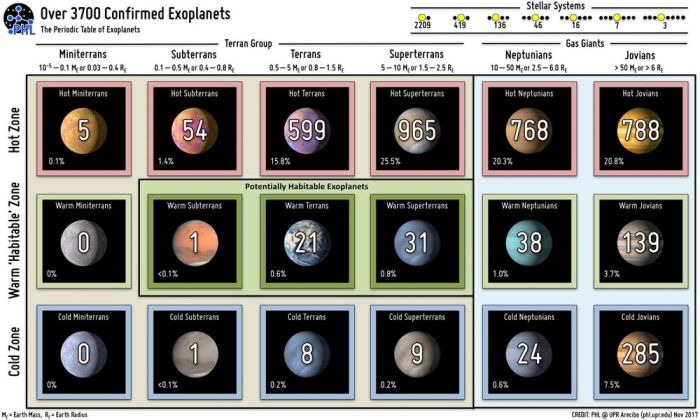 Ο αστρονόμος Abel Méndez από το Πανεπιστήμιο του Πουέρτο Ρίκο, δημιούργησε τον περιοδικό πίνακα των εξωπλανητών, όπου ταξινομούνται 3700 γνωστοί εξωπλανήτες, συμπεριλαμβανομένων και των εξωπλανητών που θα μπορούσαν να φιλοξενήσουν ζωή.