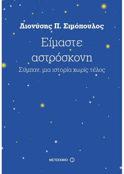 Ο διακεκριμένος αστροφυσικός Διονύσης Σιμόπουλος μας αφηγείται τη μαγική και συναρπαστική ιστορία από τη γέννηση των άστρων ως τις μαύρες τρύπες, από τα στοιχειώδη σωματίδια ως τα βαρυτικά κύματα, από τους πιο μακρινούς γαλαξίες ως το ανθρώπινο είδος, αυτό το βιβλίο περιγράφει το αέναο ταξίδι της υλοενέργειας που απαρτίζει το Σύμπαν. «Είμαστε όλοι μας αστρόσκονη, και κάποια μέρα θα ξαναγυρίσουμε στα άστρα. Κάποια μέρα θα υπάρξουν άλλοι κόσμοι, γεμάτοι με άλλα όντα, αστράνθρωποι σαν εμάς, που θα γεννηθούν από τις στάχτες ενός, κάποιου άλλου, πεθαμένου άστρου. Ενός άστρου που σήμερα το λέμε Ήλιο».