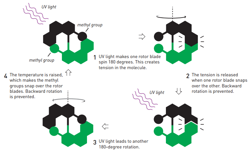 Κάθε κρίκος όταν τροφοδοτούνταν από επιπλέον ενέργεια μπορούσε να περιστρέφεται με τρόπο προκαθορισμένο και ελεγχόμενο από τους ερευνητές. Ηταν το πρότυπο των μοριακών μηχανών μη βιολογικής προέλευσης.