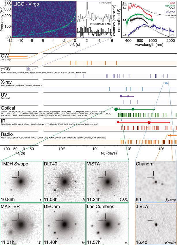Στη συνέχεια, εντοπίζοντας το σημείο του ουρανού όπου είχε συμβεί η συγχώνευση των άστρων, στις παρυφές του γαλαξία NGC4993, η διεθνής αστρονομική κοινότητα ήταν σε θέση να στρέψει μια σειρά από ραδιοτηλεσκόπια, οπτικά, υπέρυθρα και τηλεσκόπια ακτίνων-γάμα για να μελετήσει το ίδιο φαινόμενο. Μπόρεσε έτσι για πρώτη φορά, εκτός από τα βαρυτικά κύματα, να «δει» την πολλαπλή ακτινοβολία που επίσης δημιουργήθηκε και ταξίδεψε στο διάστημα, φθάνοντας ως τη Γη.