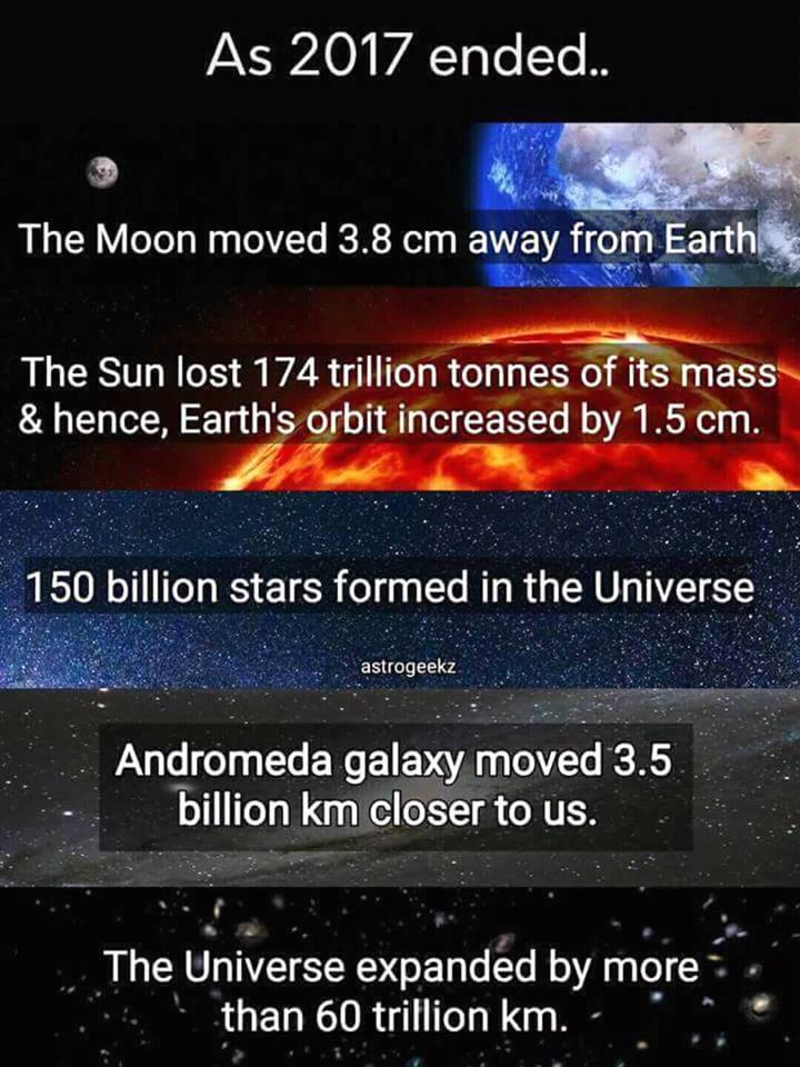 * Ο Ήλιος έχασε 174 τρισεκατομμύρια τόνους από τη μάζα του και γι’ αυτό η τροχιά της Γης γύρω από τον Ήλιο μεγάλωσε κατά 1,5 εκατοστό του μέτρου.