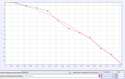 Προσεγγίζοντας την καμπύλη της κατακόρυφης συνιστώσας y συναρτήσει του χρόνου ως παραβολή, προκύπτει η εξίσωση: