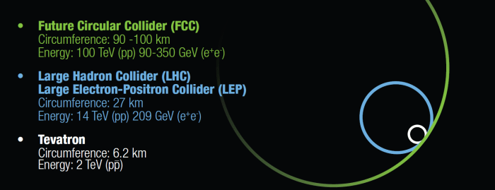 Πρόκειται για τον «Κυκλικό Επιταχυντή του μέλλοντος» (Future Circular Collider), που θα έχει περιφέρεια 100 χιλιομέτρων, και σε αυτόν θα γίνονται συγκρούσεις πρωτονίων με πρωτόνια, ηλεκτρονίων με ποζιτρόνια ή πρωτόνια.