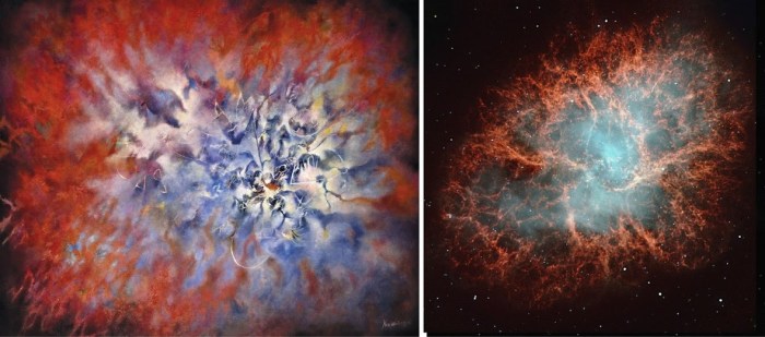 Κατά τη διάρκεια της βραδιάς θα προβληθούν σε οθόνη στον εκθεσιακό χώρο του Τελλογλείου έργα του Απόστολου Κιλεσσόπουλου από τις σειρές «Κοσμικά τοπία», «Νεφελώματα», «Fractals», «Πανσπερμία», «Σπείρες». Τα έργα αυτά θα παρουσιαστούν συγχρόνως με φωτογραφίες γαλαξιών, νεφελωμάτων, αστερισμών και άλλες εκπληκτικής ομορφιάς εικόνες του ουράνιου στερεώματος που επέλεξε ο καθηγητής Αστροφυσικής Ιωάννης Σειραδάκης αντλώντας έμπνευση από την έκθεση του Απόστολου Κιλεσσόπουλου. Ο δημιουργός των έργων τέχνης θα αναφερθεί στο καθένα από αυτά και τις πηγές της έμπνευσής του, ενώ από την πλευρά του ο κ. Σειραδάκης θα ταξιδέψει το κοινό στο αχανές σύμπαν.