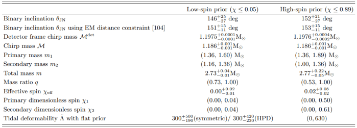 Στην πρώτη εργασία, επαναπροσδιορίστηκε η θέση της πηγής του βαρυτικού κύματος, η οποία περιορίστηκε σε μια περιοχή 16 deg2 με ακρίβεια 90%. Το εύρος των συχνοτήτων του βαρυτικού κύματος υπολογίστηκε έως και 23 Hz, σε σύγκριση με τα 30 Hz που είχε υπολογιστεί αρχικά. Επίσης, οι μάζες των άστρων νετρονίων βρίσκονται μεταξύ 1 και 1,89 M⊙ (M⊙=μία ηλιακή μάζα) στην περίπτωση γρήγορης ιδιοπεριστροφής των συνιστωσών και μεταξύ 1,16 και 1,60 M⊙ στην περίπτωση αργής ιδιοπεριστροφής.