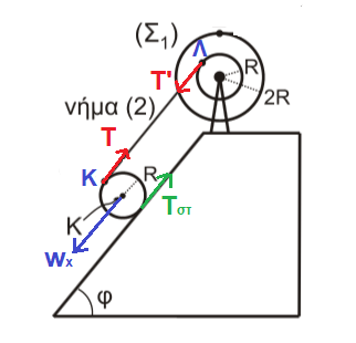 Για τον ομογενή κύλινδρο ισχύει: ΣFx=mgημφ – Τ – Τστ = m αcm (1) και Στ=ΙCM αγων